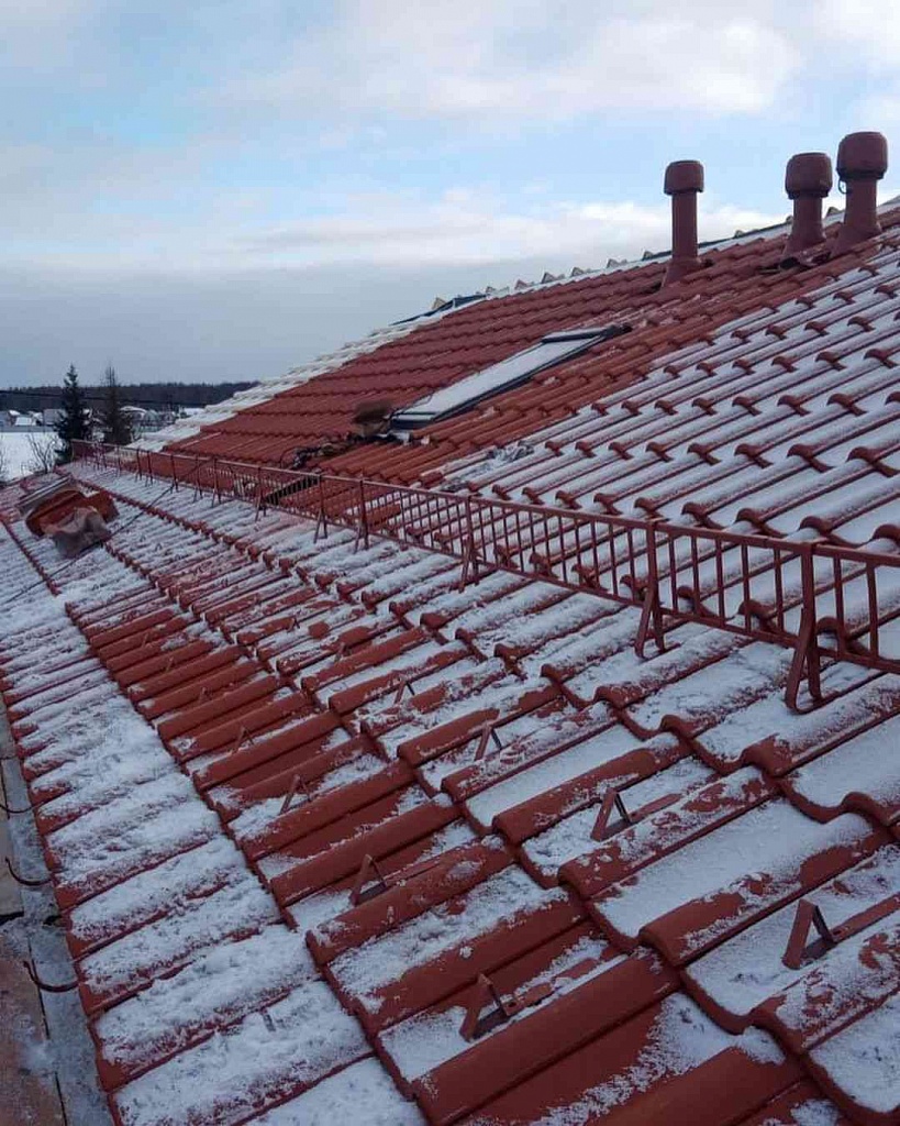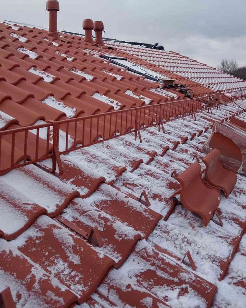 Монтаж снегозадерживающих устройств производится после окончания монтажа кровельного покрытия. Однако их установка должна быть предусмотрена еще при выведении шаговой обрешетки. При использовании в качестве кровельного материала штучной керамической или цементно-песчаной черепицы монтаж снегозадержателей должен делаться непосредственно в процессе установки элементов кровли.